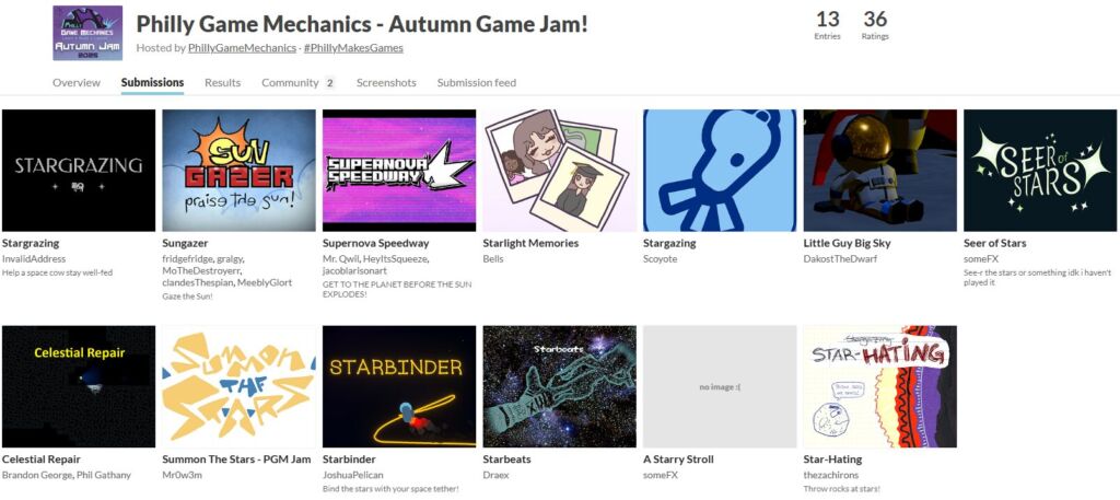 This month, PGM hosted a 10-day game jam from September 18th-28th, with an amazing kick-off event at the Drexel ExCITe Center! The theme was stargazing, and we had 13 fantastic entries, all of which can be played over on our Itch page. This jam was open to folks of all levels of experience and any and all creatives were welcome.